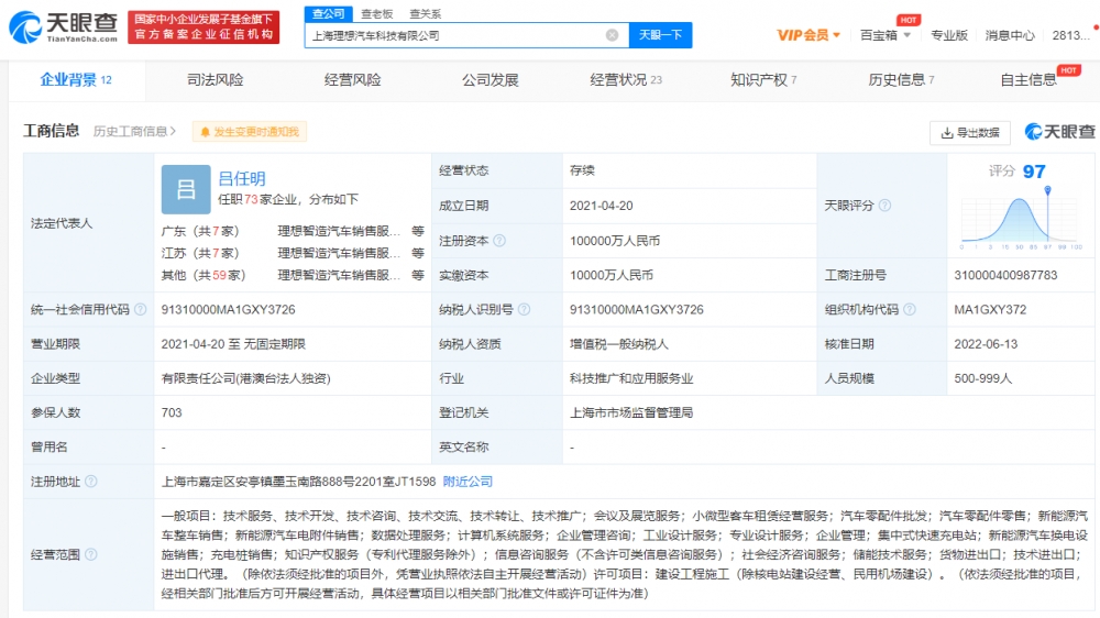 近日,上海理想汽车科技有限公司发生工商变更,李想退出法定代表人、执行董事职位,均由吕任明接任。同时,公司经营范围新增新能源汽车电附件销售;储能技术服务;建设工程施工等。该公司成立于2021年4月,注册资本10亿人民币,由Leading Ideal HK Limited全资持股。