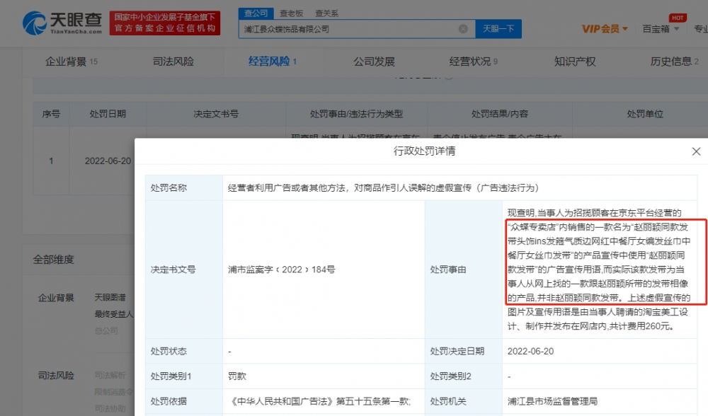 近日,浦江县众蝶饰品有限公司因对商品作引人误解的虚假宣传,被浦江县市场监督管理局罚款1000元。处罚事由显示,当事人为招揽顾客,将网店内销售的一款发带宣称为“赵丽颖同款发带”,而实际该款发带为当事人从网上找的一款跟赵丽颖所带的发带相像的产品,并非赵丽颖同款发带。