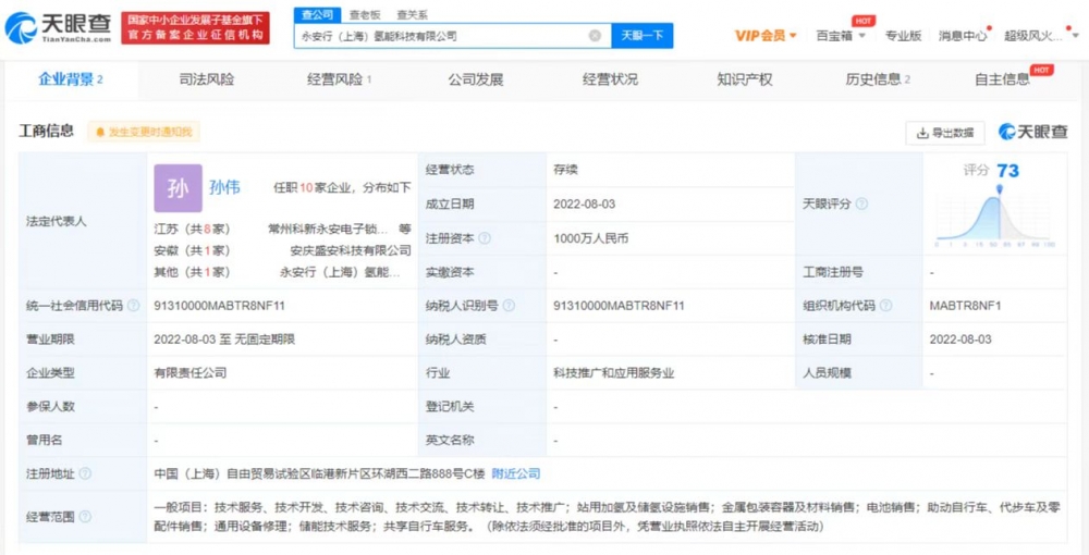 近日,永安行(上海)氢能科技有限公司成立,法定代表人为孙伟,注册资本1000万人民币,经营范围包括站用加氢及储氢设施销售;助动自行车、代步车及零配件销售;储能技术服务;共享自行车服务等。股东信息显示,该公司由永安行科技股份有限公司全资持股。