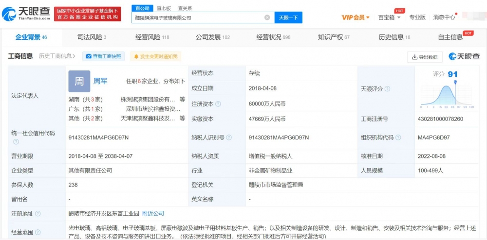 该公司成立于2018年4月,法定代表人为周军,经营范围包括光电玻璃、高铝玻璃、电子玻璃基板、屏蔽电磁波及微电子用材料基板生产、销售等。股东信息显示,该公司最大股东为上市公司株洲旗滨集团股份有限公司。