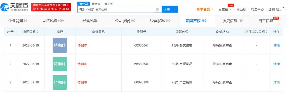 近日,特步(中国)有限公司申请注册3枚“特咖啡”商标,以及3枚“XTEP COFFEE”商标,国际分类为餐饮住宿、方便食品、广告销售,当前商标状态均为等待实质审查。